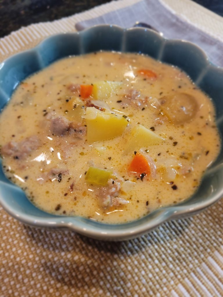 Preheat a large pot over medium heat. Add the sausage and cook and crumble to break apart. When sausage is browned, remove and set aside. Reserve 1 tablespoon of drippings in the pan. Add 2 tablespoons of butter. Add the diced onion, carrots, and celery and cook for 5 minutes. Add the garlic and cook for 1 minute. Add the flour and cook for 2 minutes. Slowly add the chicken stock while cleaning/scraping the crumbles from the bottom of the pan. Slowing stir in the heavy cream, soy sauce, hot sauce, and spices. Bring to a boil then reduce to a simmer. Clean the potatoes, dry them, and dice into 1-inch pieces. Add to the soup, simmer uncovered until fork tender, about 20-25 minutes. Add the sausage back to the pan and stir to combine. Reduce heat to low and stir in cheese if using.